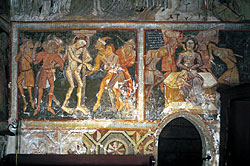 kostolom. Väčšina jeho vnútorných stien je pomaľovaná fresco a secco výjavmi